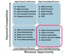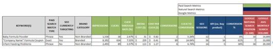 Use PPC data, sorting by top KPI performers, matched by keyword against your targeted SEO keywords (e.g. match “baby formula powder” performance data from your PPC campaign to “baby formula powder” from organic search). This will help you focus resources on keyword/keyword phrases that either rank poorly in organic search or don’t rank at all so that you can optimize existing content or develop new content. Remember: this is based off revenue numbers to help evaluate the opportunity rather than just traffic estimates.